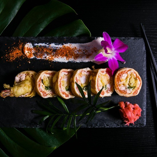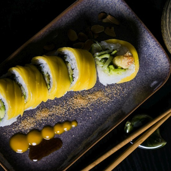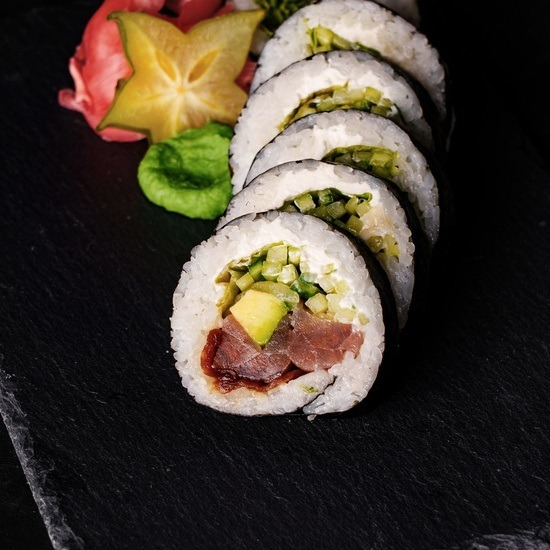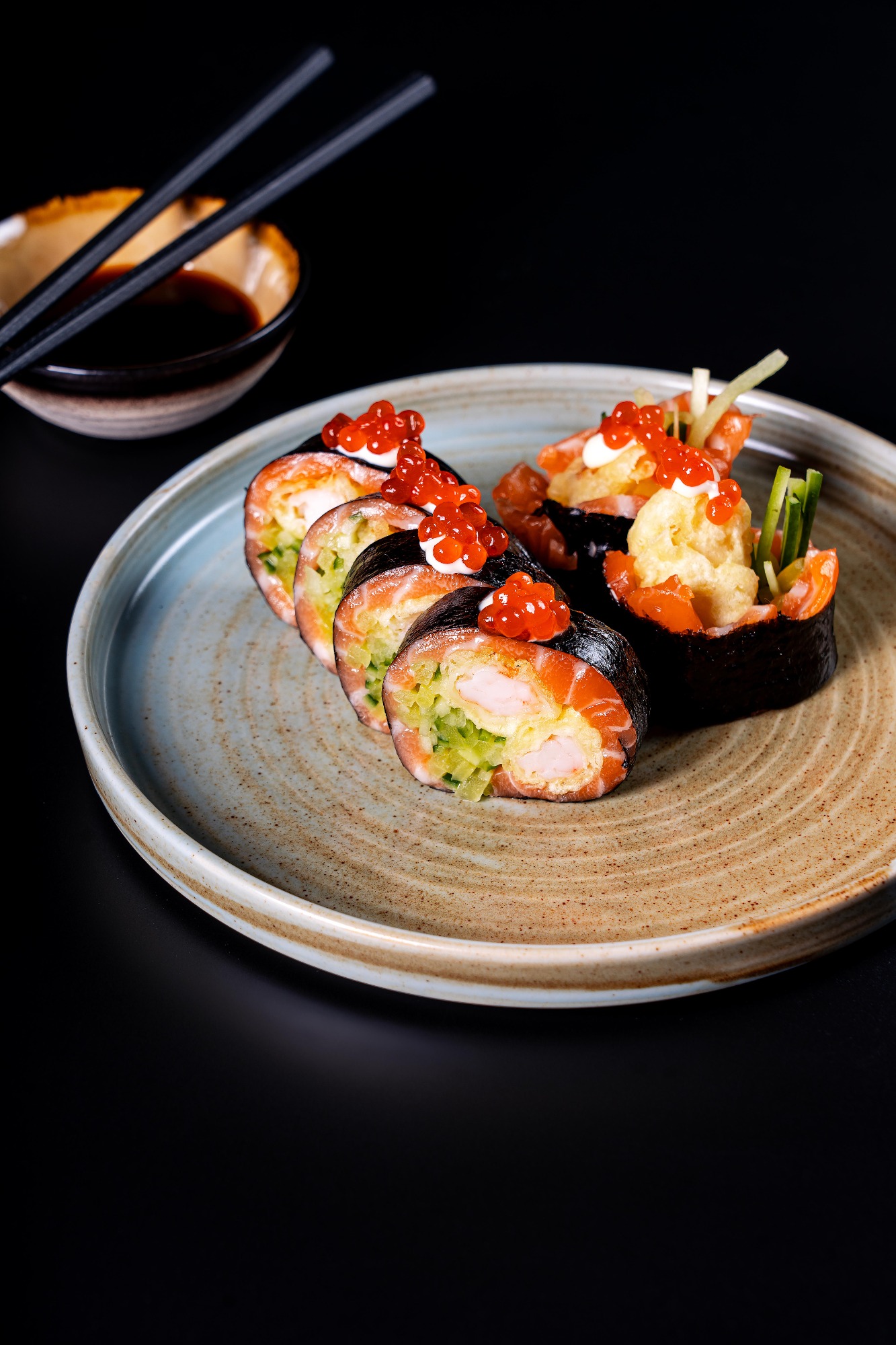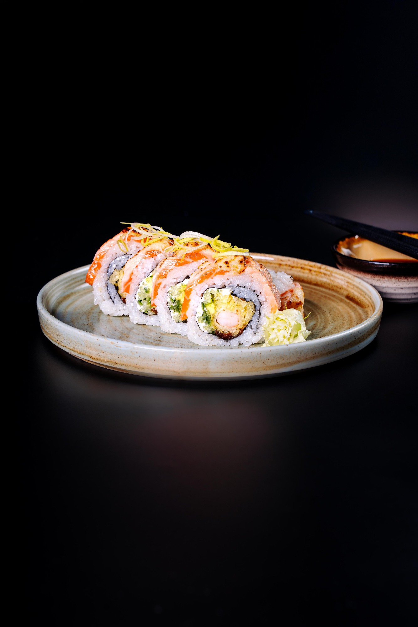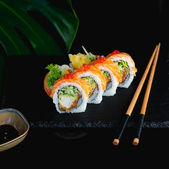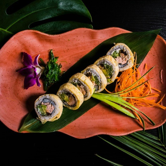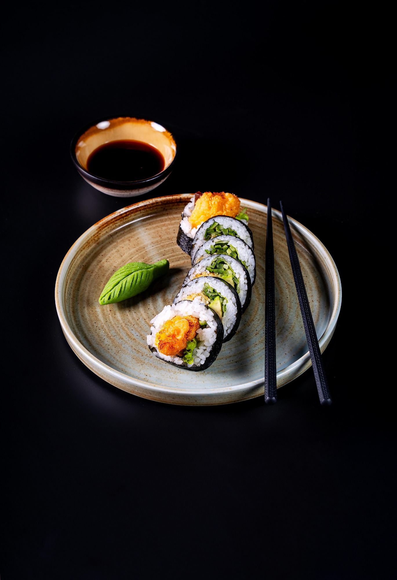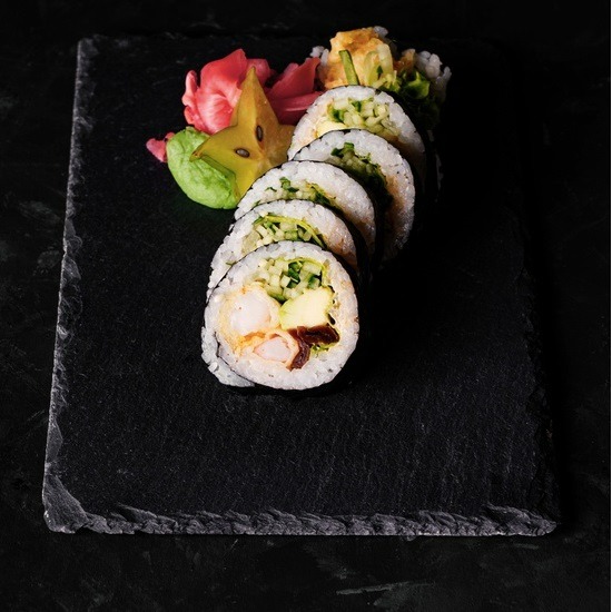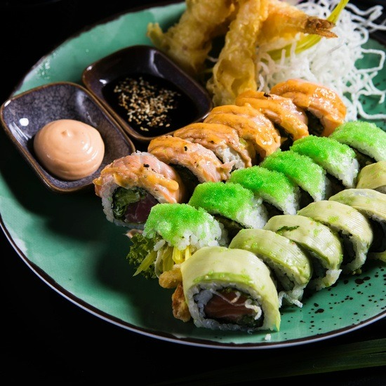 ryba maślana w tempurze, sałata, ogórek, awokado, tykwa, spicy majo, sos teriyaki -