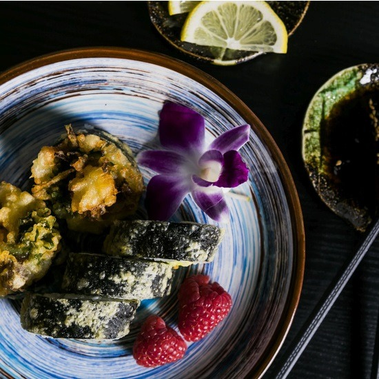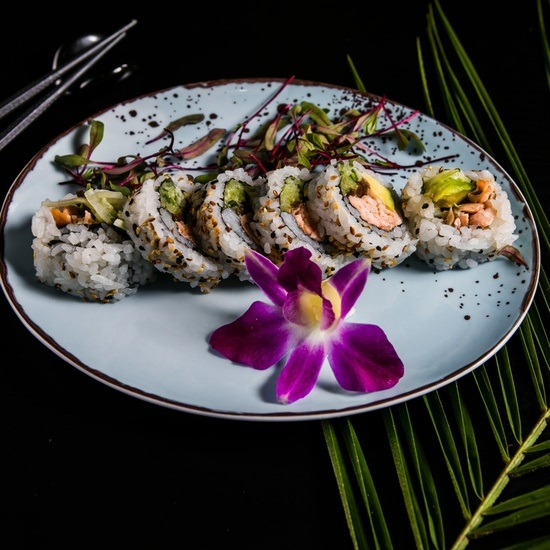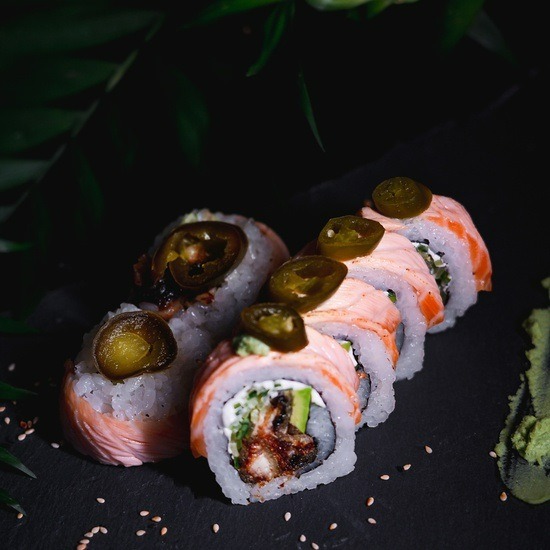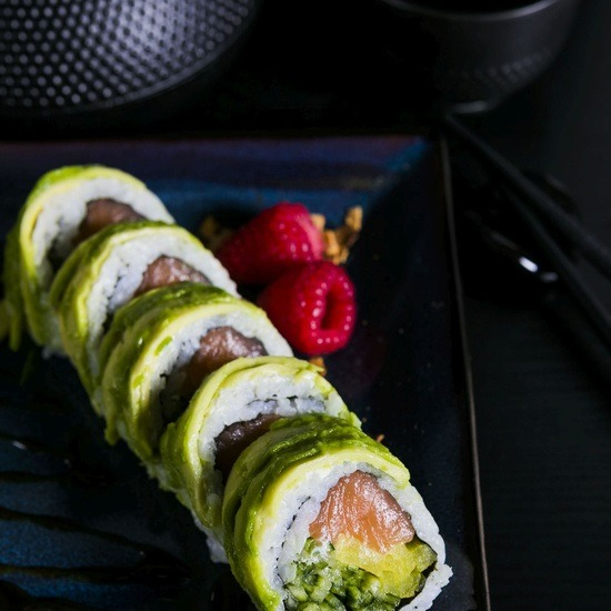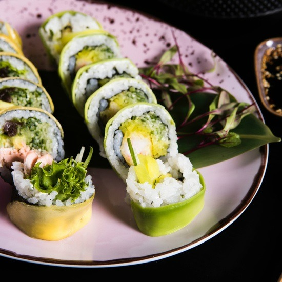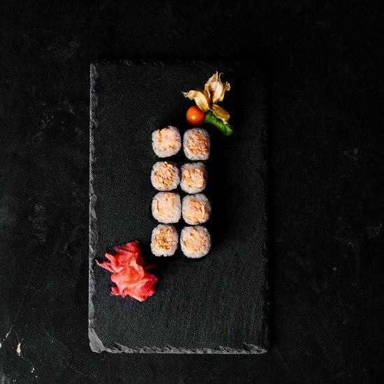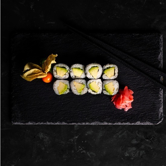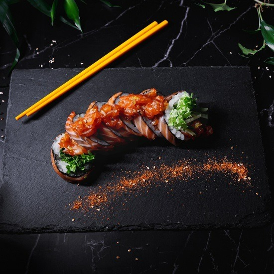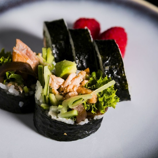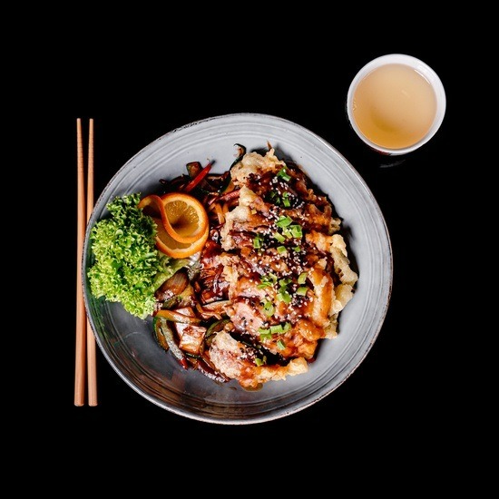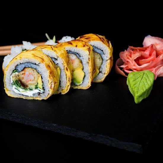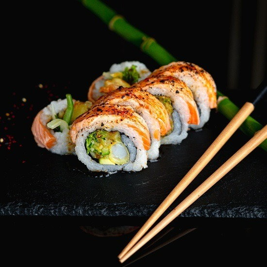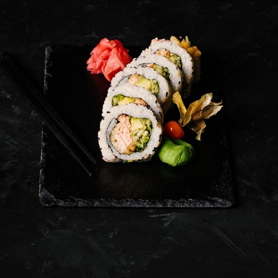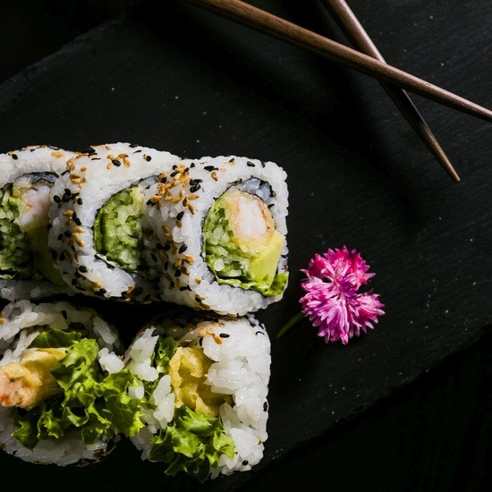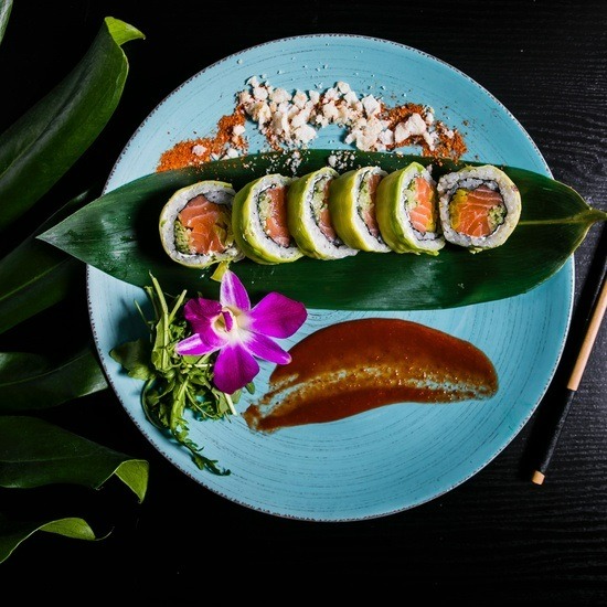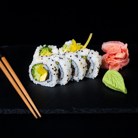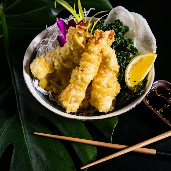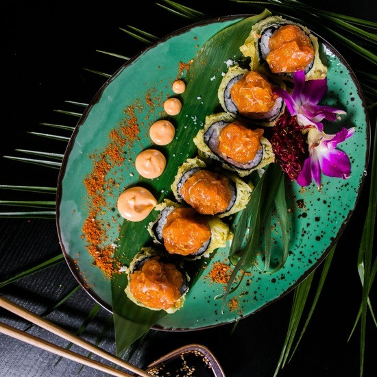 ryba maślana w tempurze, sałata, ogórek, awokado, tykwa, spicy majo, sos teriyaki -
