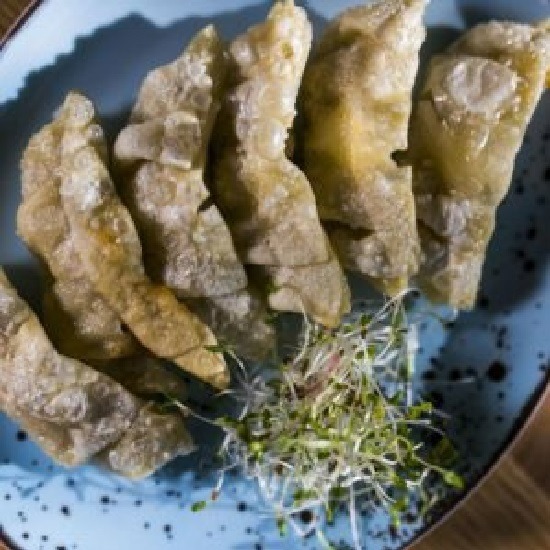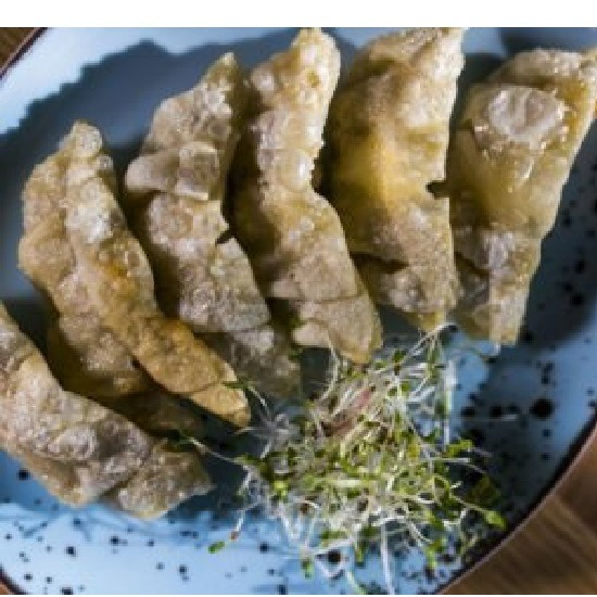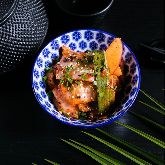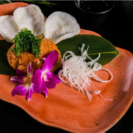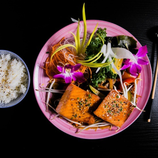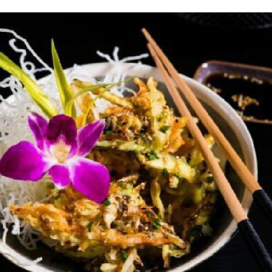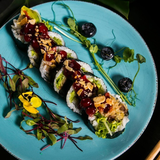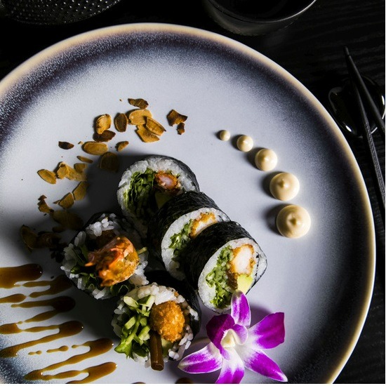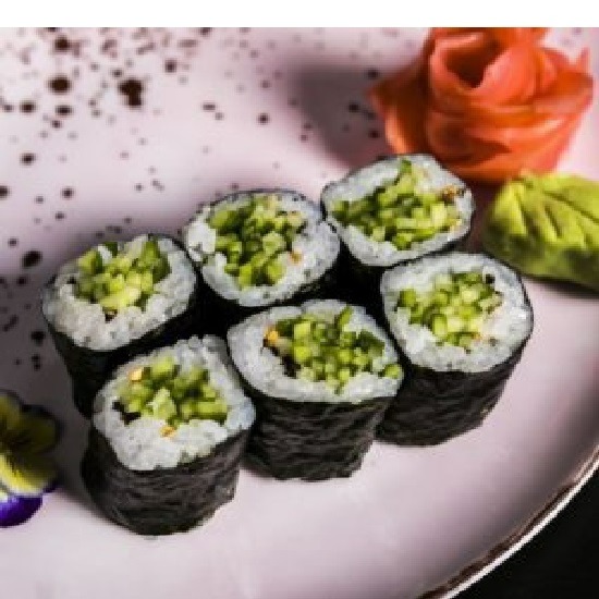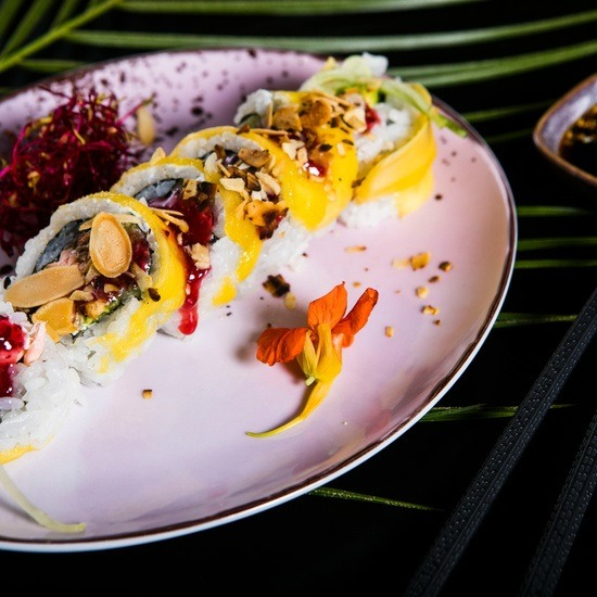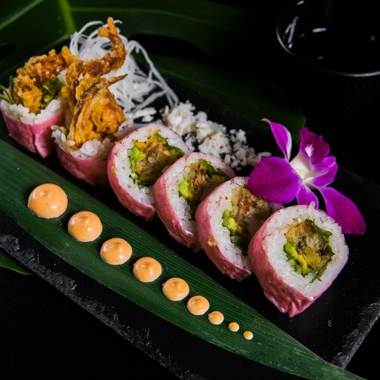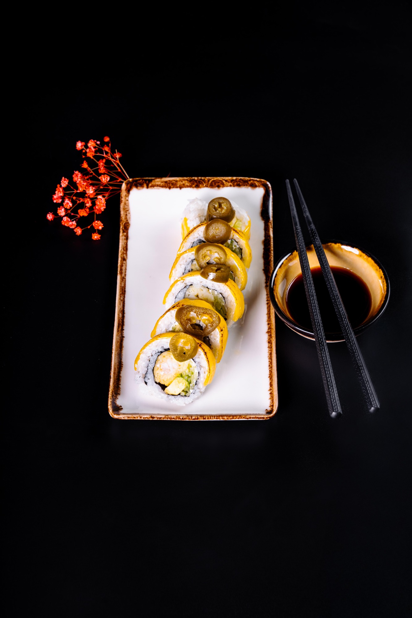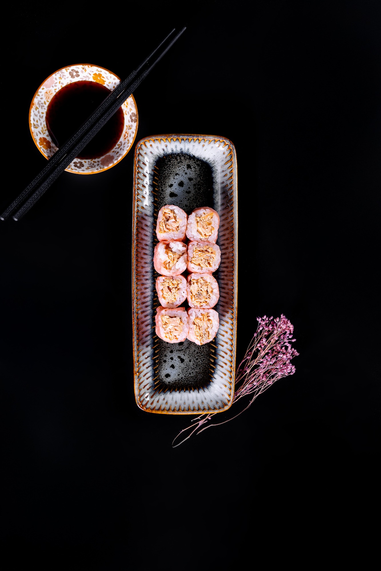 ryba maślana w tempurze, sałata, ogórek, awokado, tykwa, spicy majo, sos teriyaki -