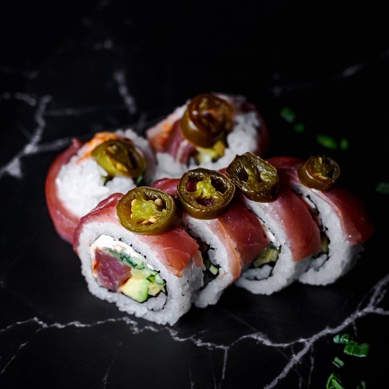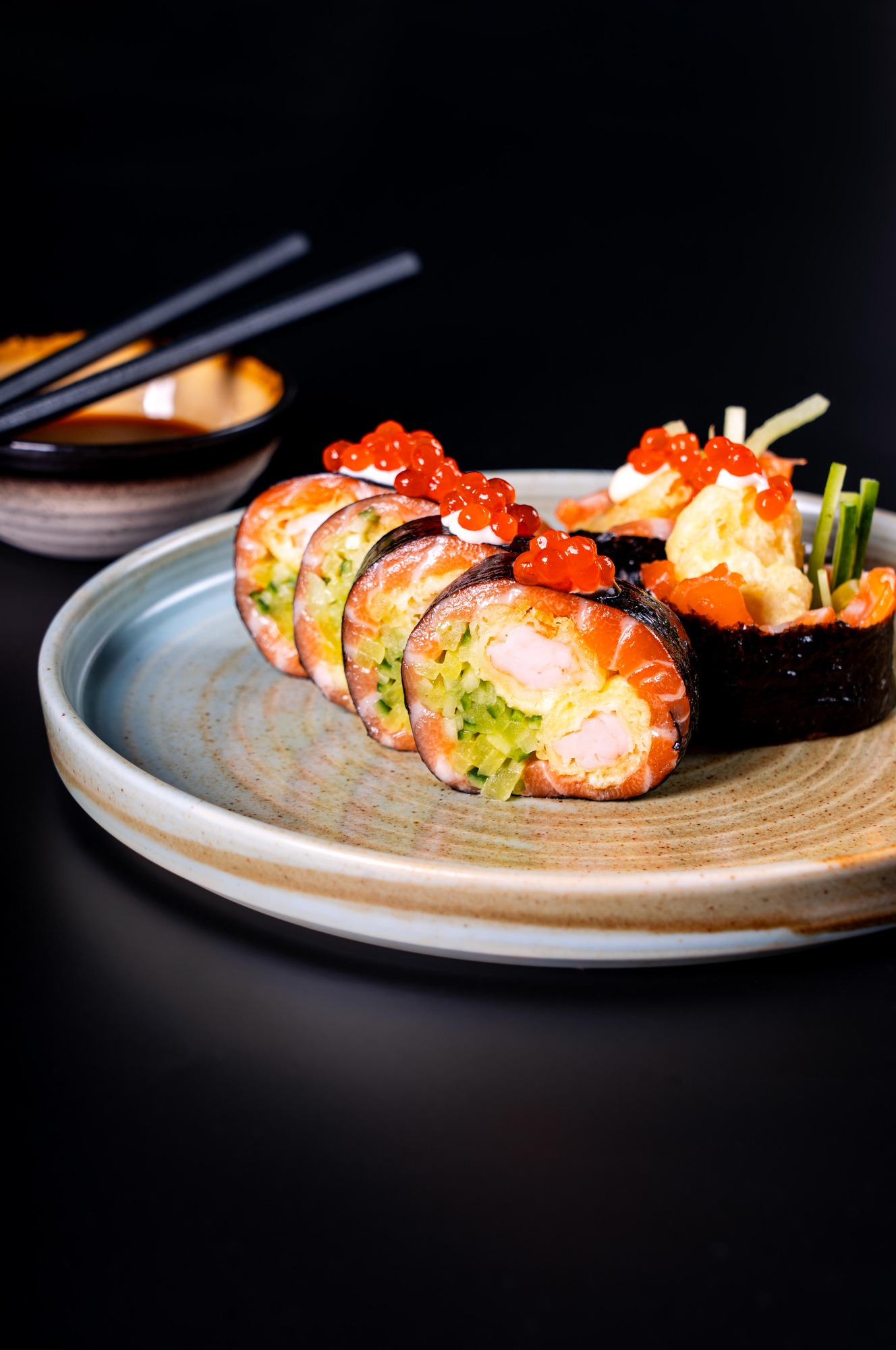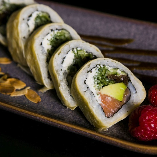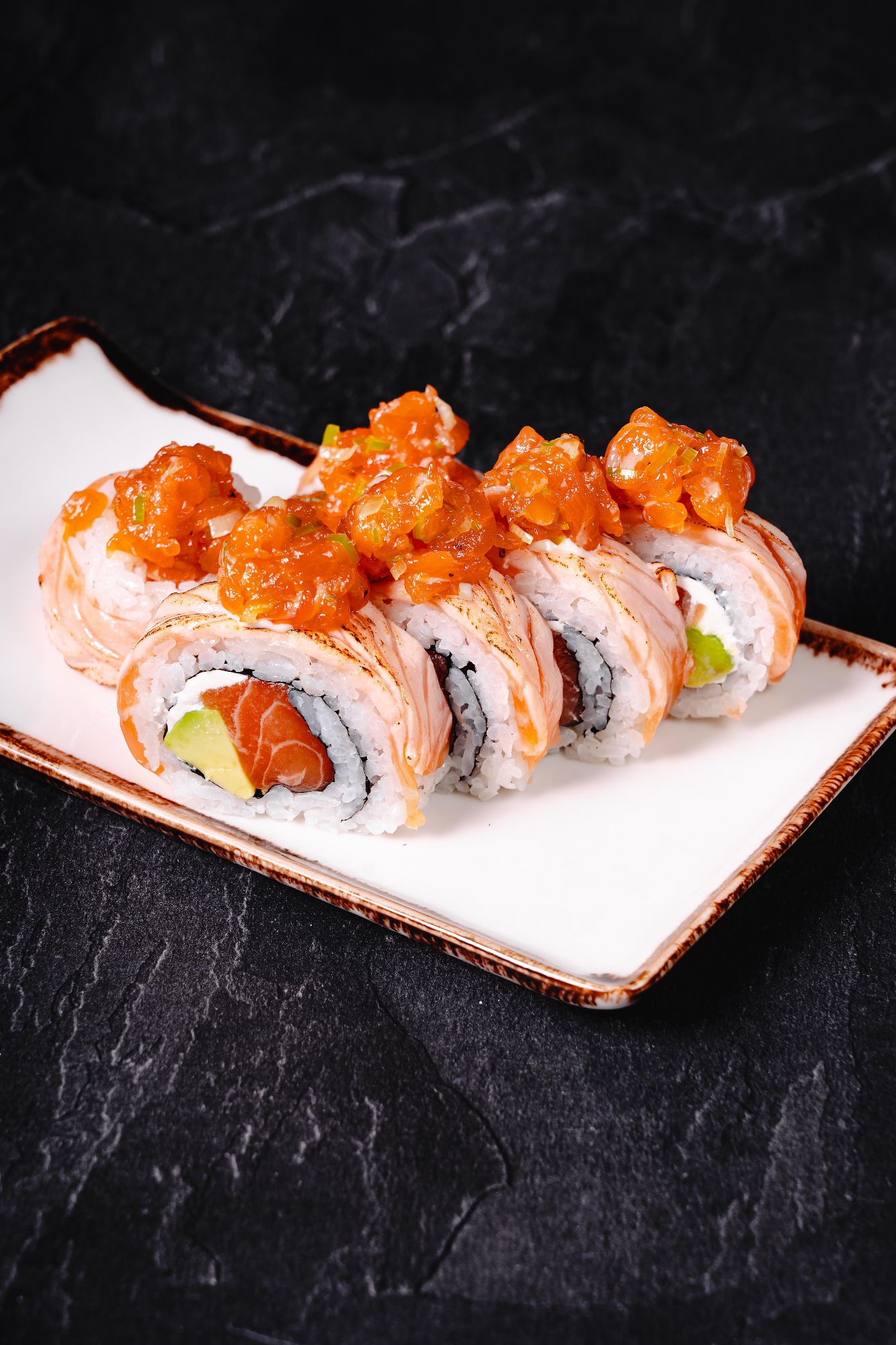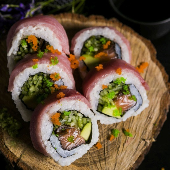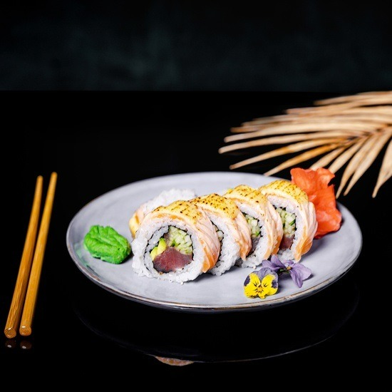 6 szt futo z tatarem z łososia cała rolka w tempurze, 6 szt california tamago z łososiem, 6 szt california z krewetką w tempurze owinięta węgorzem, 6 szt california z tuńczykiem posypana tobico, 6 szt california z łososiem owinięta krewetką gotowaną(Alergeny: orzechy, migdały i produkty pochodne) -