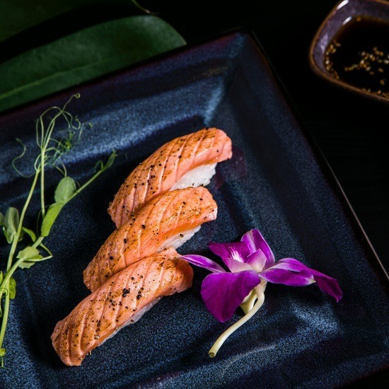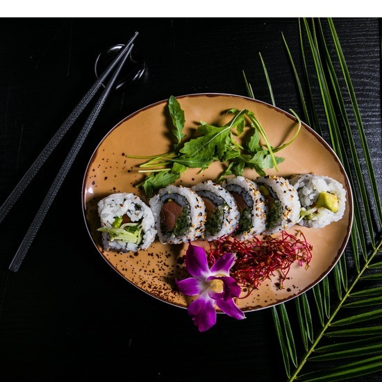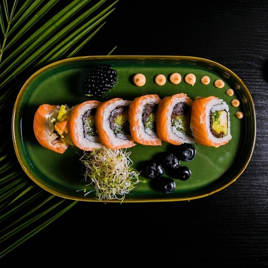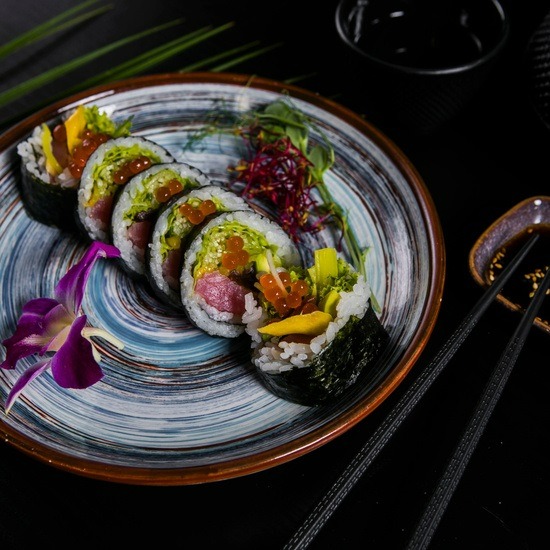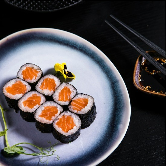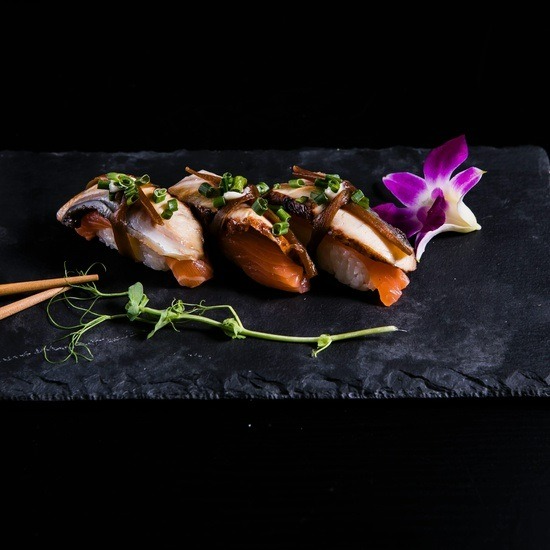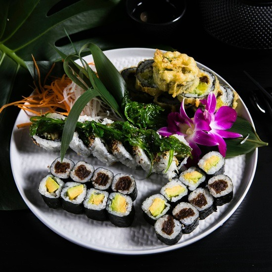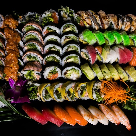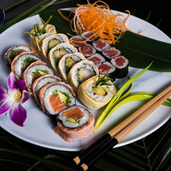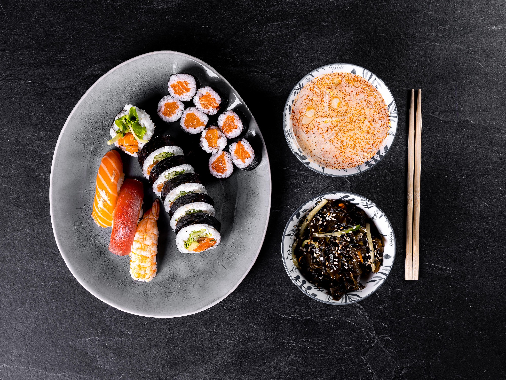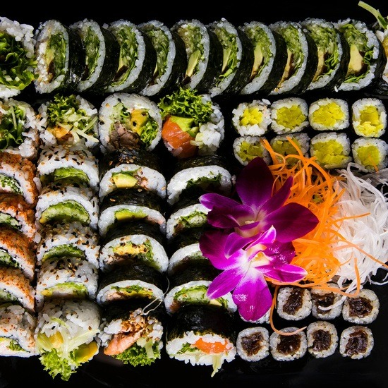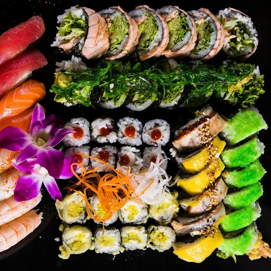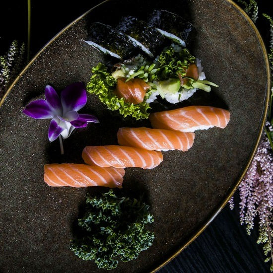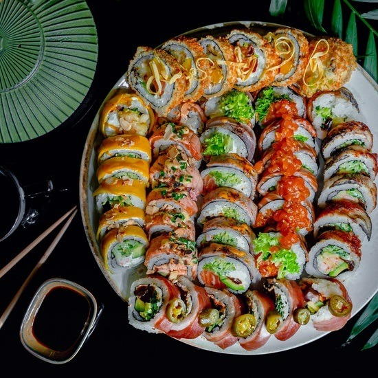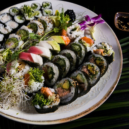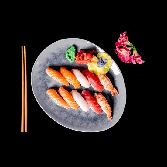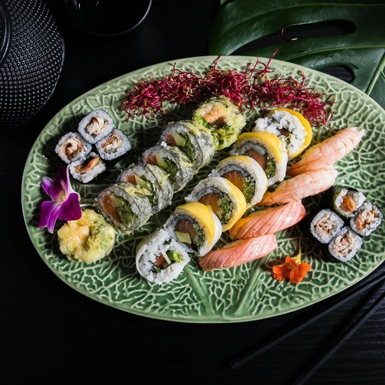 2 szt nigiri z łososiem, 2 szt nigiri z rybą maślaną, 2 szt nigiri z tuńczykiem, 2 szt nigiri z krewetką gotowaną , 8 szt hoso z rybą maślaną na ostro, 8 szt hoso z rzepą marynowaną cała rolka w tempurze, 6 szt futo z pieczonym łososiem owinięte opalanym łososiem, 6 szt futo z tuńczykiem w panko i z trawą morską, 6 szt california z łososiem owinięta węgorzem i mango, 6 szt california z krewetką w tempurze rolka w tobico (Alergeny: orzechy, migdały i produkty pochodne) -