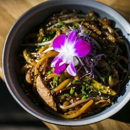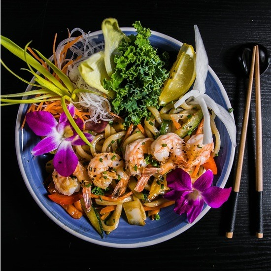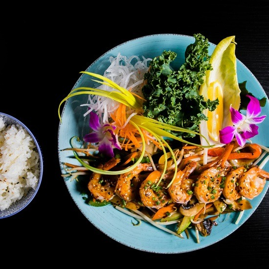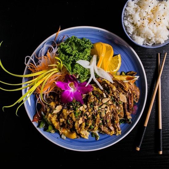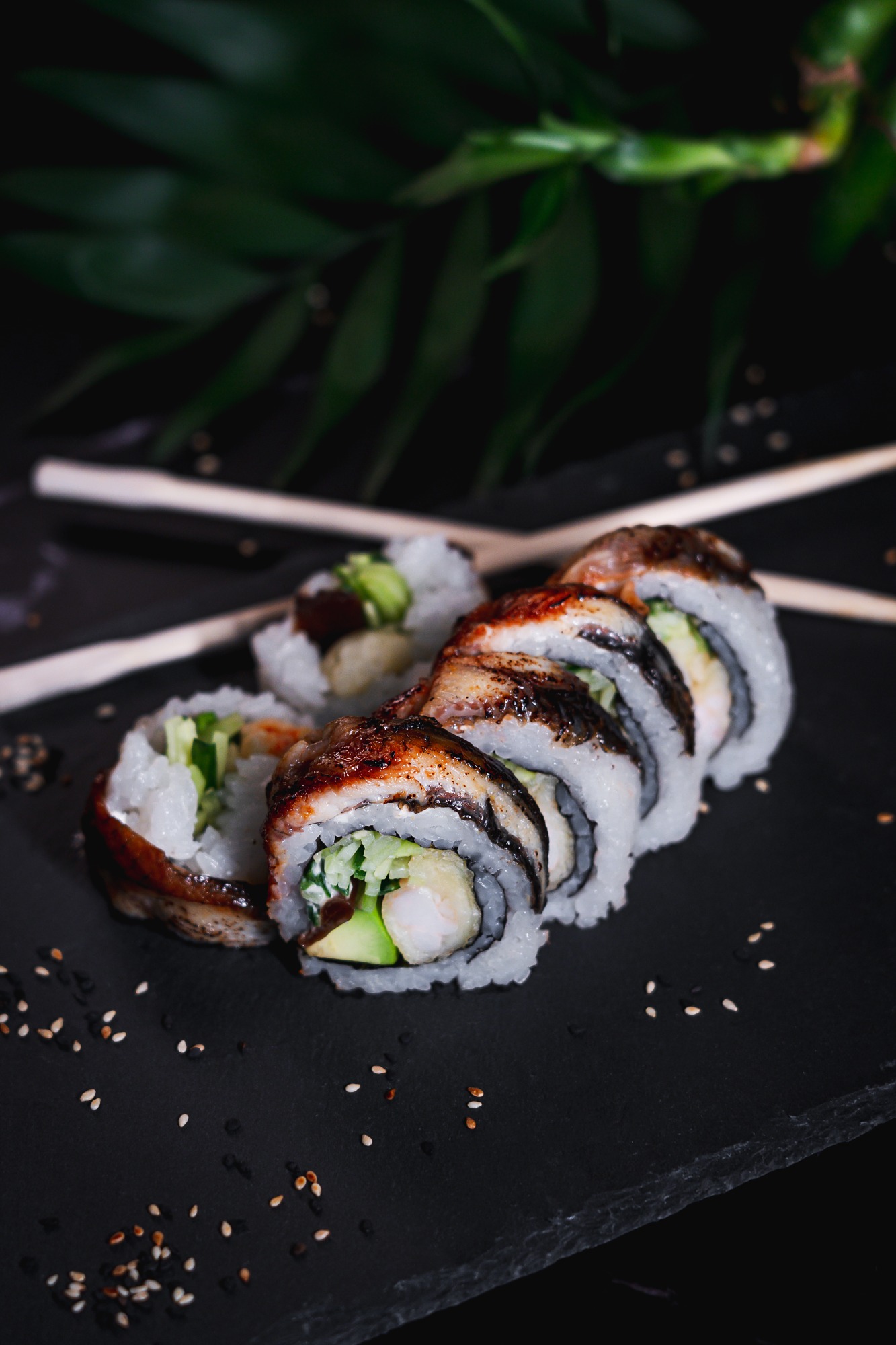 grillowany węgorz w tempurze, sałata, ogórek, awokado, tykwa, majonez, sos teriyaki, prażone migdały