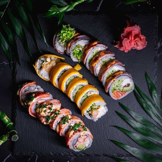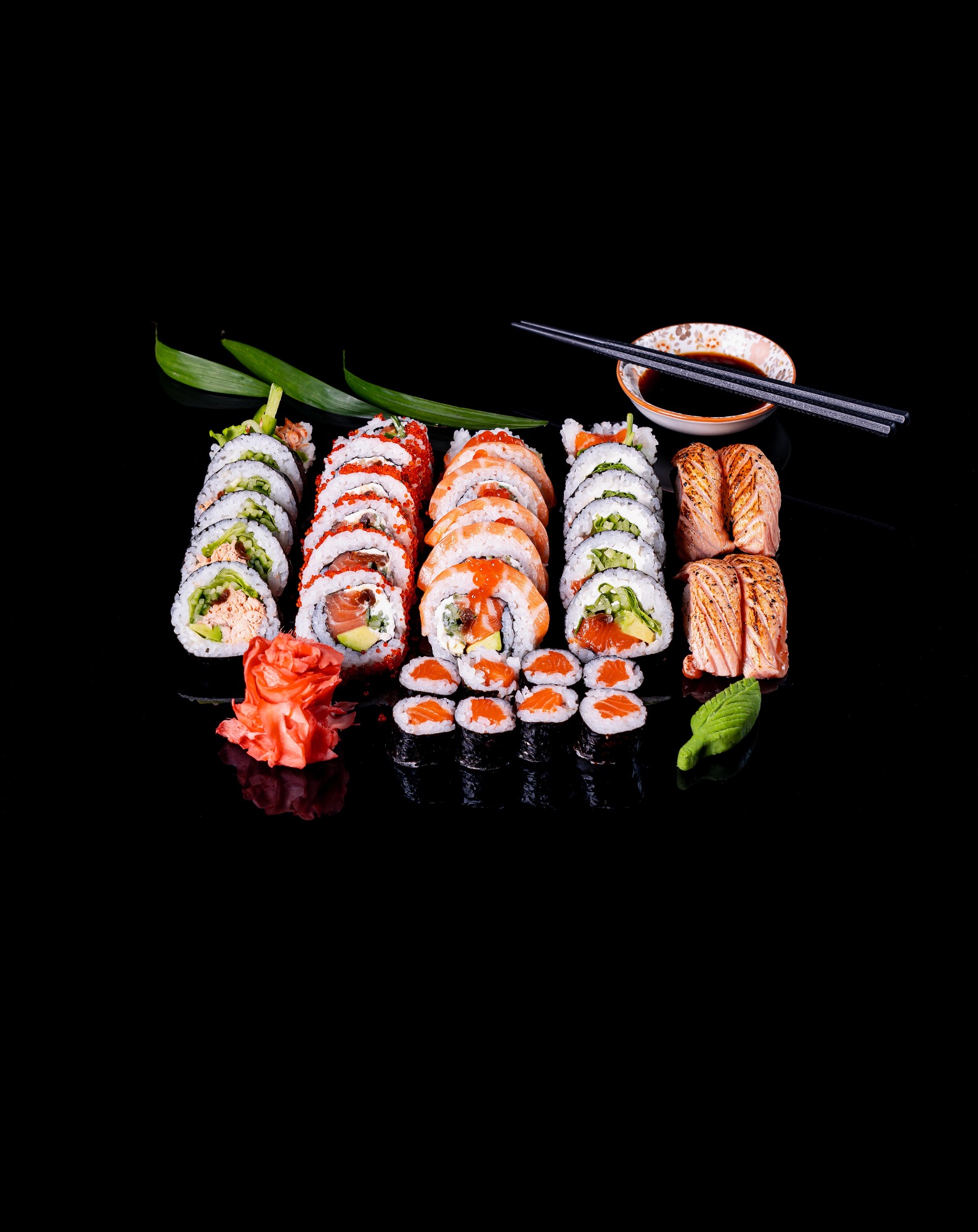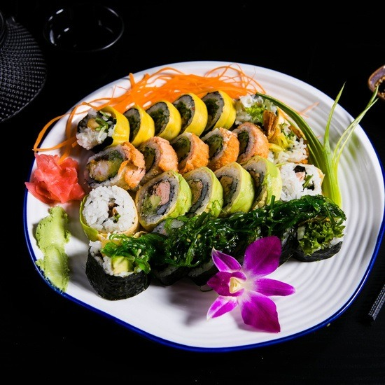 2 szt nigiri z łososiem, 2 szt nigiri z tuńczykiem, 2 szt nigiri z rybą maślaną, 2 szt nigiri z krewetką gotowaną, 6 szt futo z tatarem z łososia, 6 szt futo z łososiem, 6 szt futo z pieczonym łososiem owinięte opalanym łososiem, 6 szt futo z rybą maślaną w tempurze, 6 szt rainbow maki, 6 szt geisha maki, 6 szt california z krewetką w tempurze rolka w tobico, 6 szt kegon maki, 6 szt california z tuńczykiem rolka w togarashi, 6 szt mango grill salmon (Alergeny: orzechy, migdały i produkty pochodne)