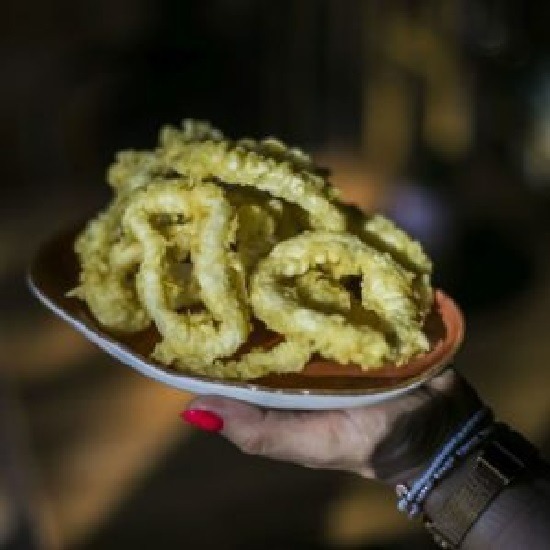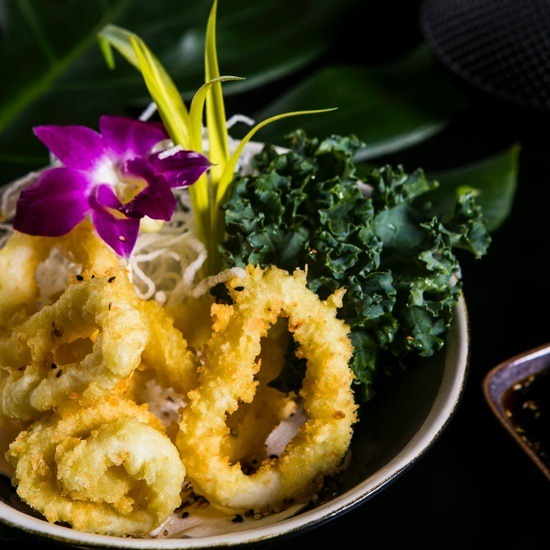 kalmar w tempurze, spicy mayo, awokado, sałata, ogórek, tykwa, sos teriyaki -