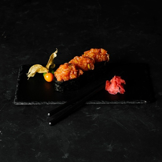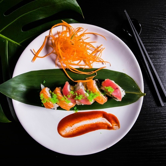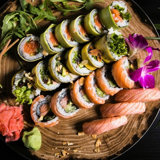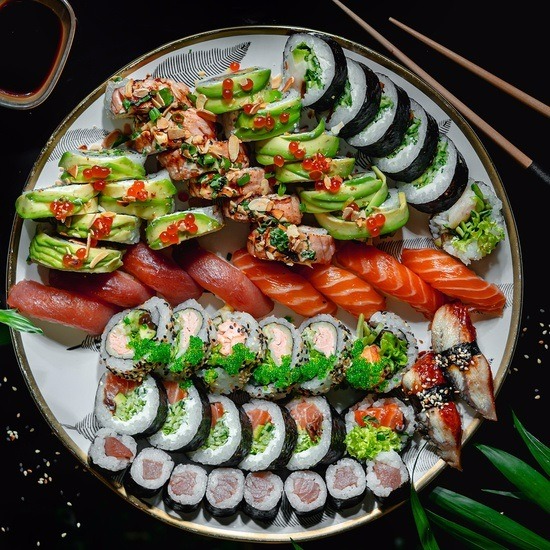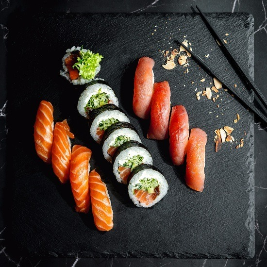 4 szt nigiri tuńczyk, 4 szt nigiri łosoś, 2 szt nigiri węgorz, 6 szt geisha maki z łososiem, 6 szt geisha maki z tuńczykiem, 6 szt griil gold, 6 szt futo philadelphia z łososiem, 6 szt futo philadelphia z rybą maślaną, 6 szt california z łososiem w tempurze w tobico, 8 szt hoso z tuńczykiem (Alergeny: orzechy, migdały i produkty pochodne) -